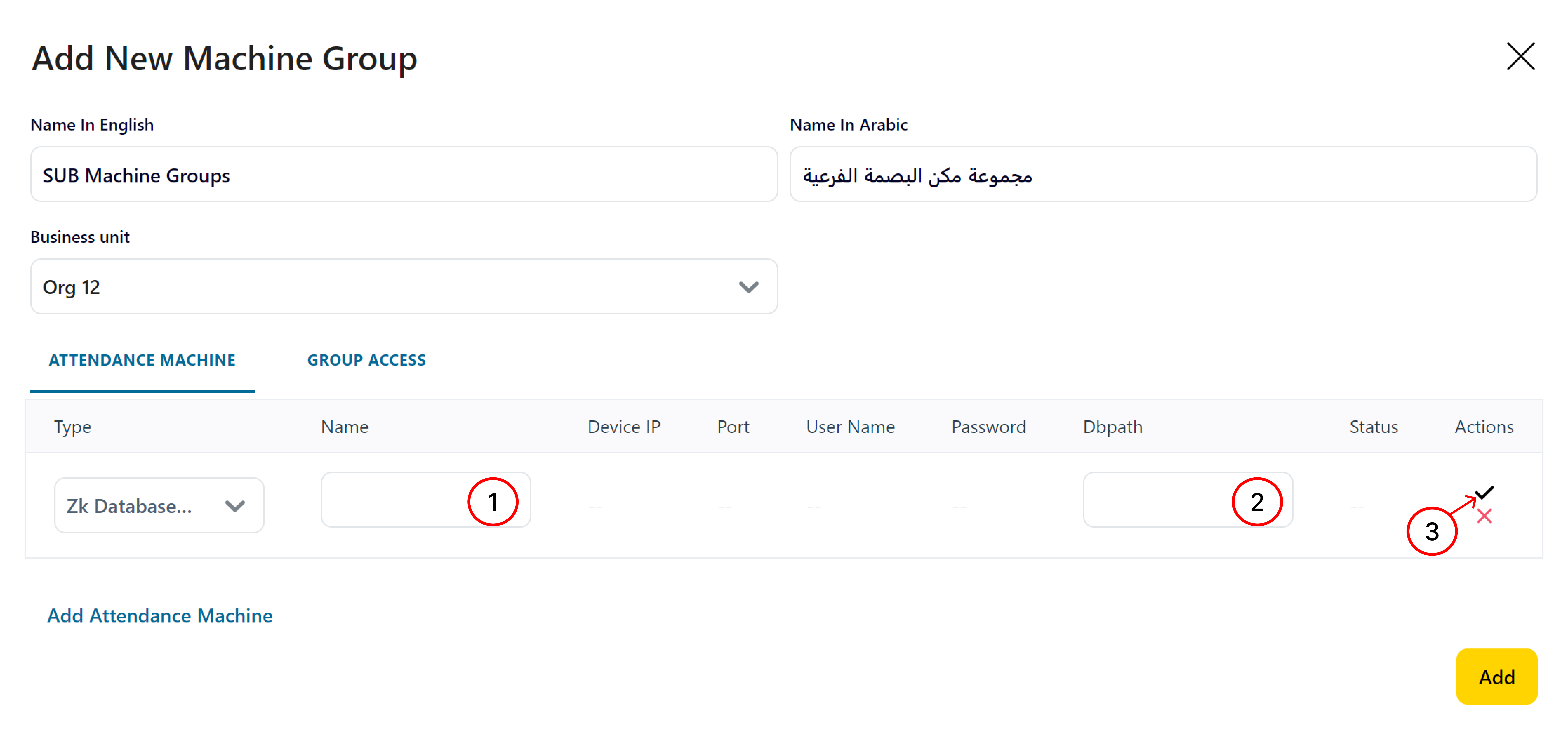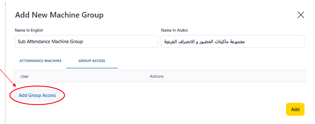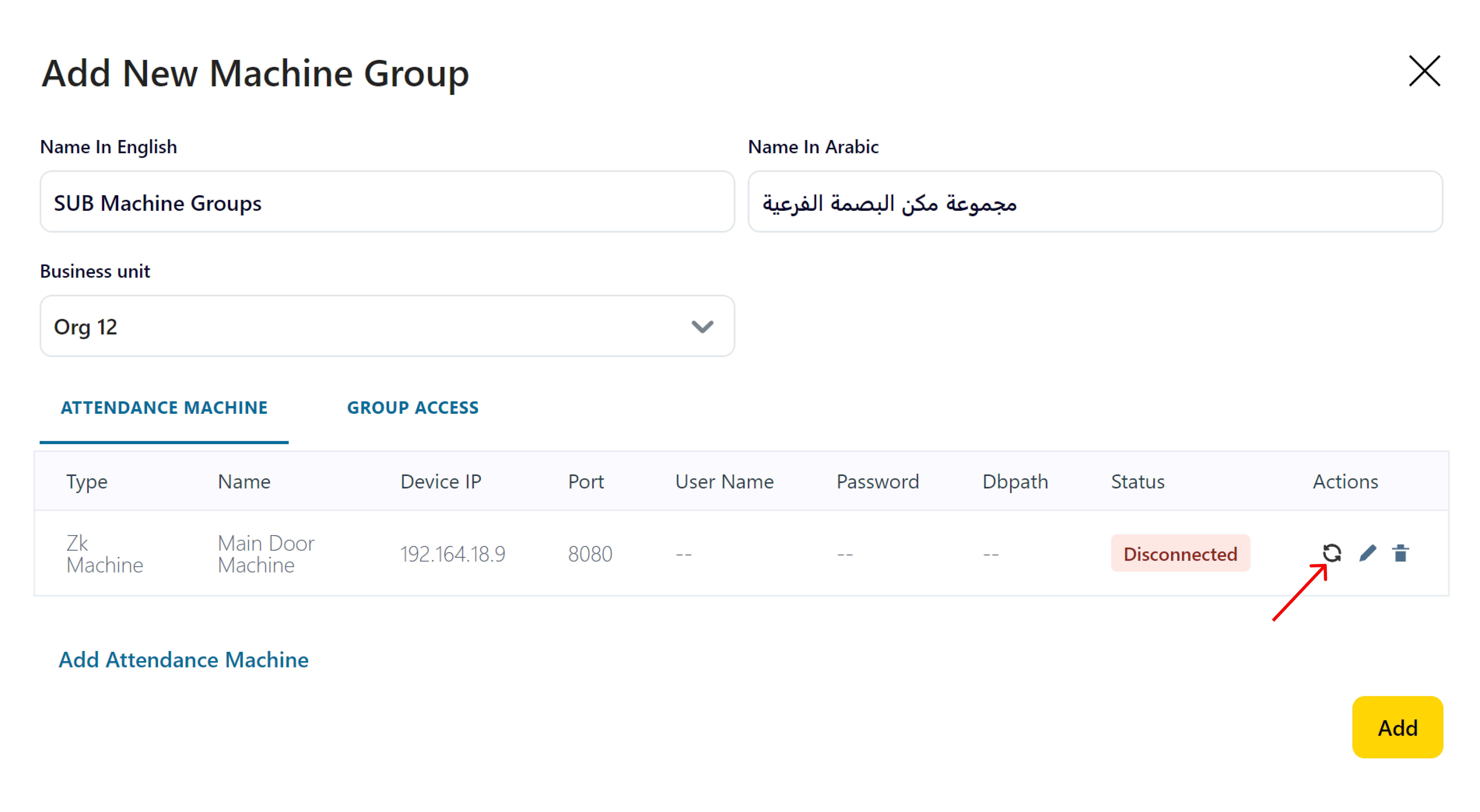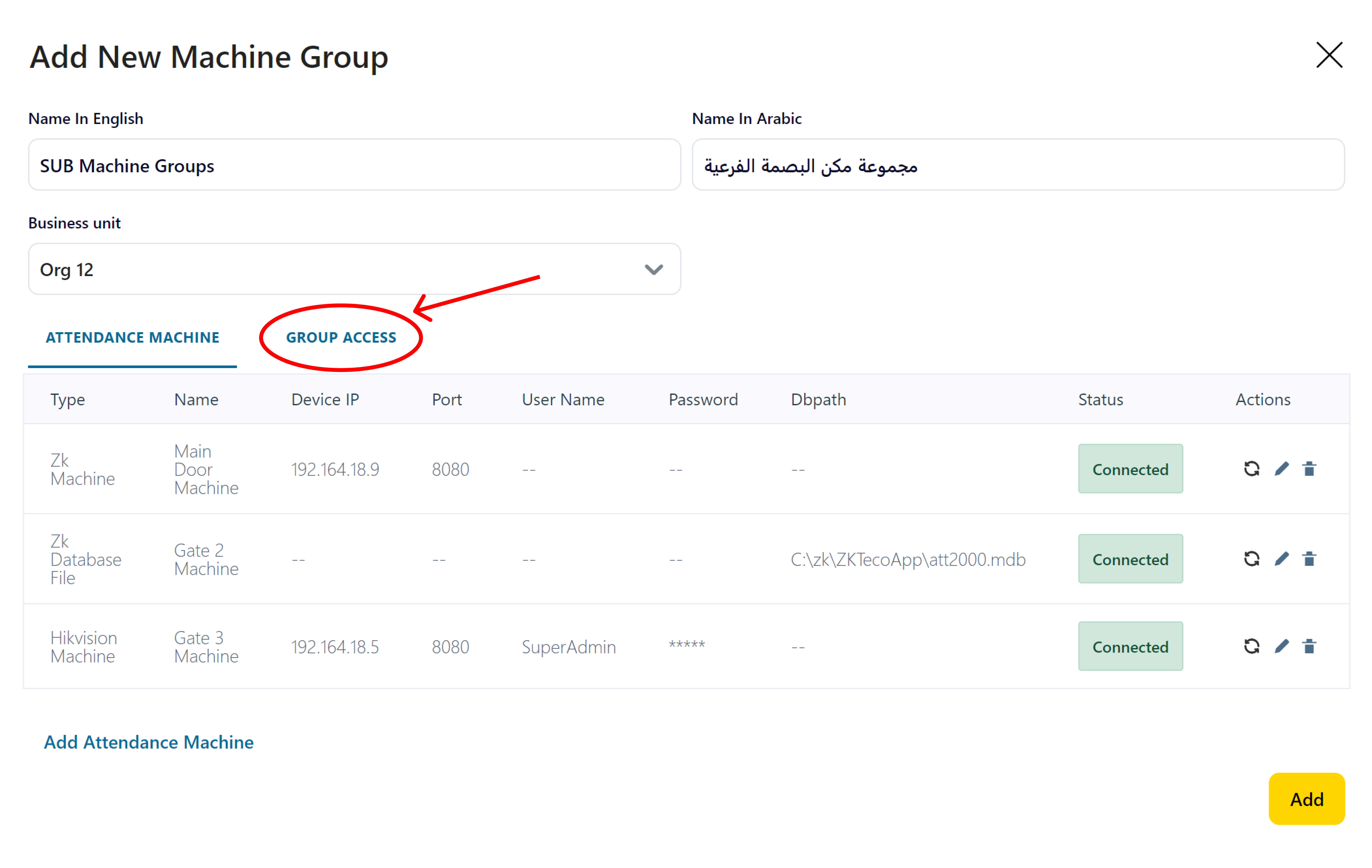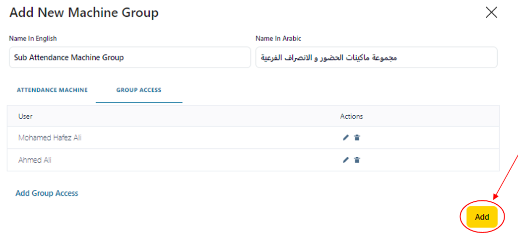 16- Click on “Add” Button to add the created Attendance Machine Group