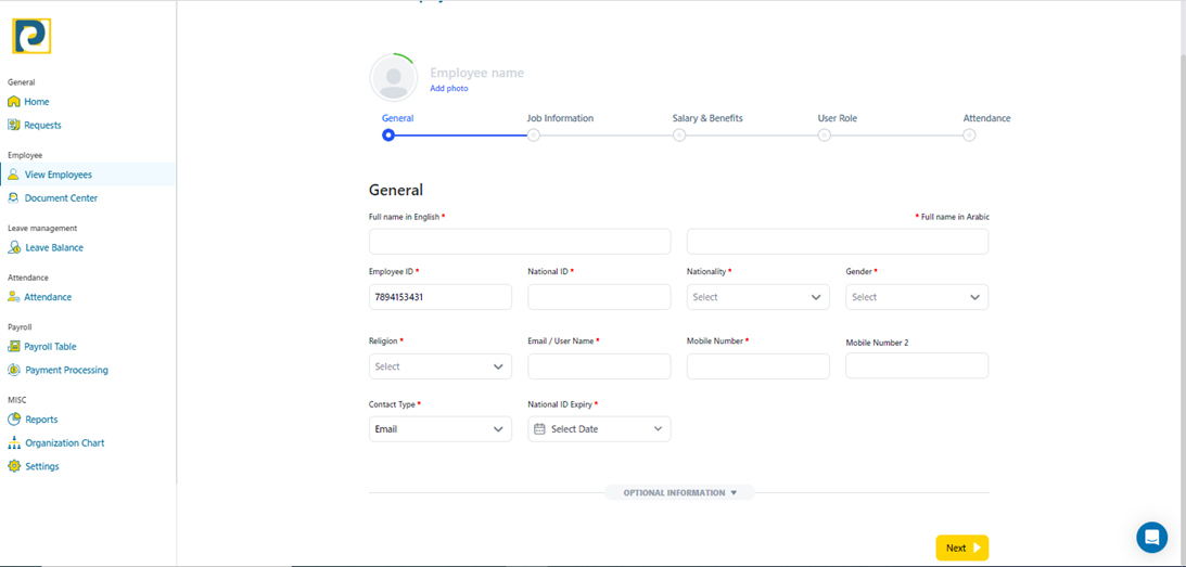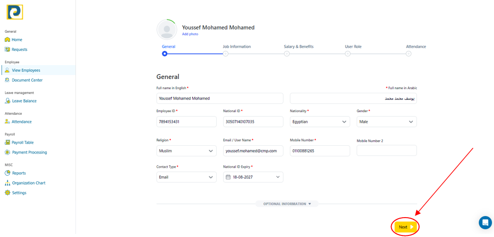 3.2-Full Name in Arabic: Mandatory field such that Employee Name should be typed in Arabic Language as written in National ID card