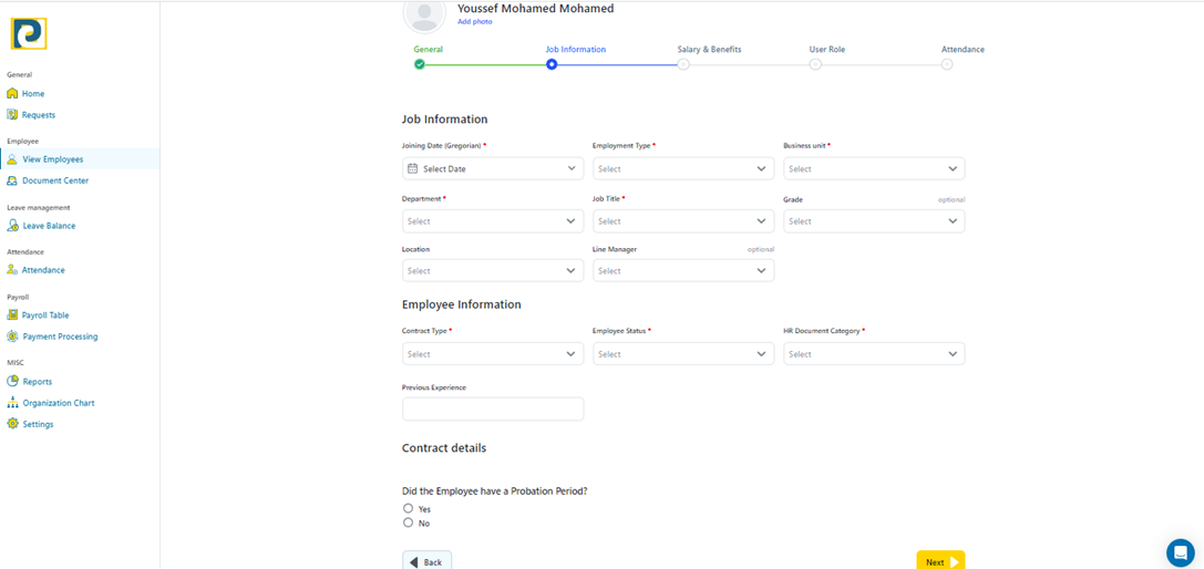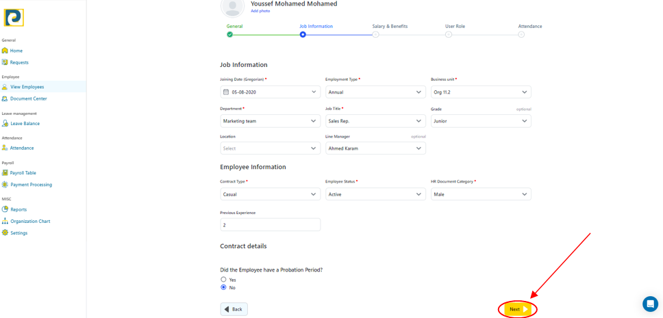 5.13-Probation: if the employee has a probation period or not if “Yes” is selected, probation period is automatically set to 90 days and could be changed