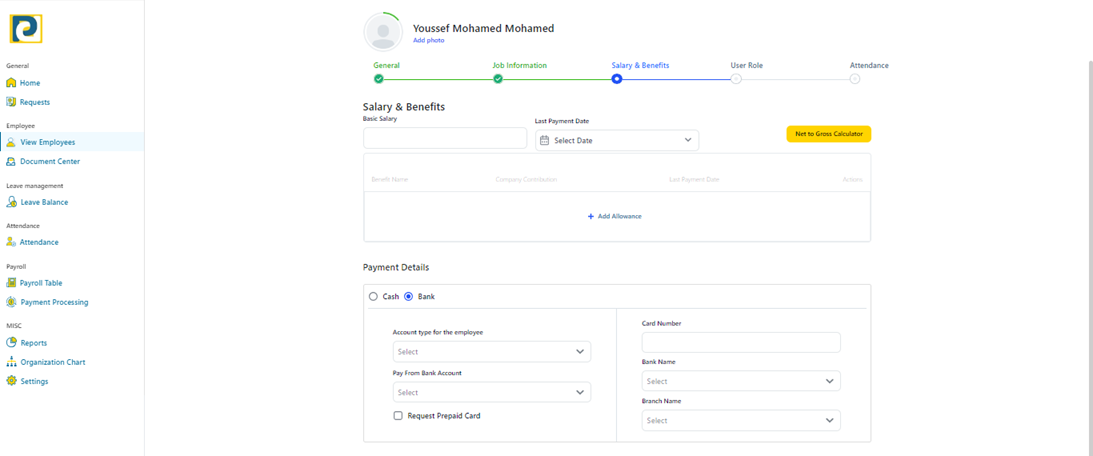 7.1.1-Basic Salary: Basic Salary of employee in numbers, “Net to Gross Calculator” button could be used to automatically calculate Gross Salary from Net Salary