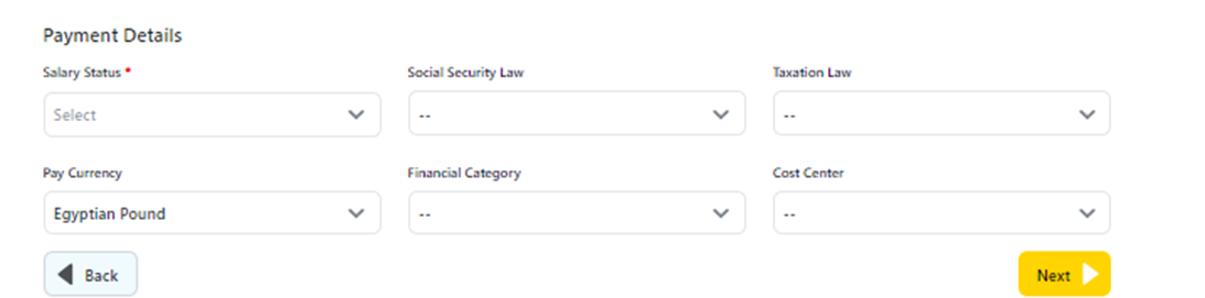 7.3.3-Taxation Law: could be left empty or chosen from pre-added Taxation Laws in Laws Settings, notice that Egypt Social Security Law is pre-defined