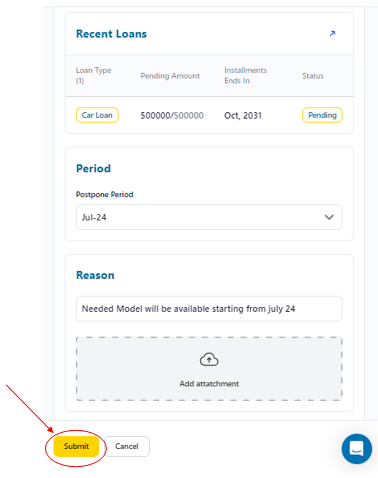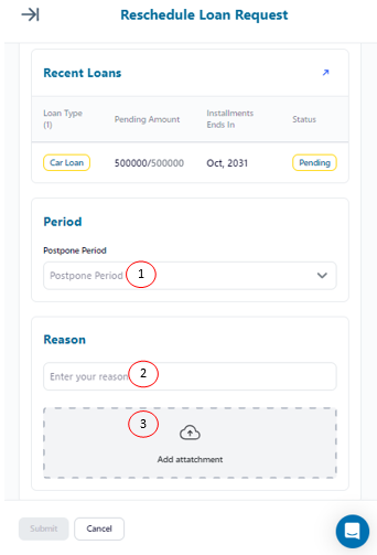 5- Choose the required Loan to be Rescheduled, scroll down then fill in Loan Reschedule Request required information as follows